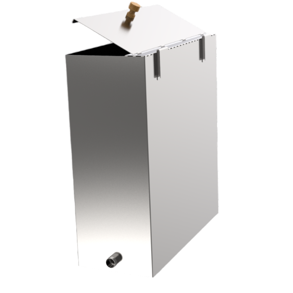 Позвонить в отдел монтажаБак предназначен для хранения и нагрева воды. Нагрев воды в баке происходит за счет нагрева стенки печи. Для фиксации на печи на задней стенке бака расположены два крепления. На боковой части бака расположен штуцер 3/4" для крепления крана. Расположение штуцера может быть на передней стенке, а так же слева или справа. Крышка откидная-съемная