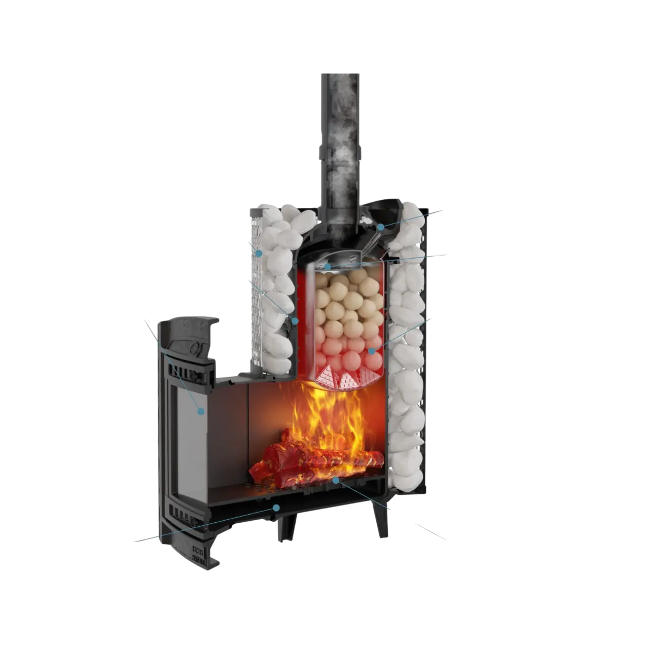 Позвонить в отдел монтажаБанная печь «Атмосфера XL» с сеткой из нержавейки создана для прогревания больших помещений площадью до 26 м³. Ее компактность и инновационные технологии, использованные в конструкции, обеспечивают повышение коэффициента полезного действия и долгосрочной службы в любых климатических условиях. Одной из главных конструкционных особенностей модели является топка с винтовыми каналы. Пламя по ним, перед тем как выйти в трубу, поднимается, закручиваясь в три оборота, что позволяет улучшить производительность на 30%. Две каменки разных размеров изнутри и снаружи печи, а также паровая пушка, обеспечивают быстрый нагрев натуральных камней, которыми заправляется специальный отдел, и образование мелкодисперсного пара всего за полчаса работы. Другой особенностью является колосниковое днище с отверстиями, обеспечивающее равномерное поступление кислорода и горение топлива с полноценным нагревом стенок с полным отсутствием перегрева.