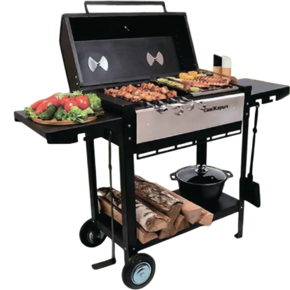 - Два боковых складных столика — удобно для размещения продуктов, напитков, посуды или готового шашлыка.