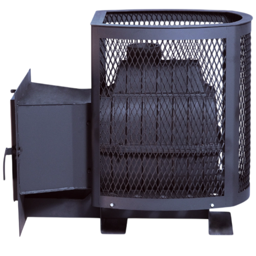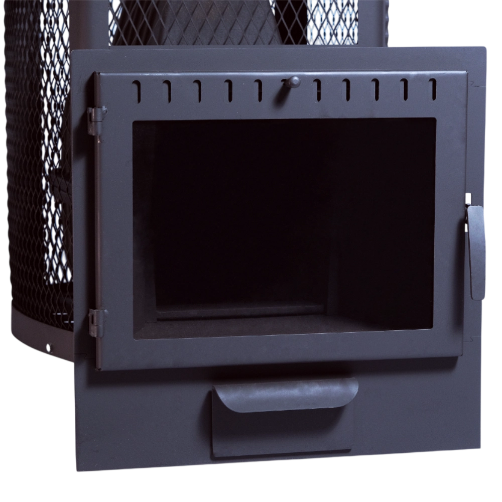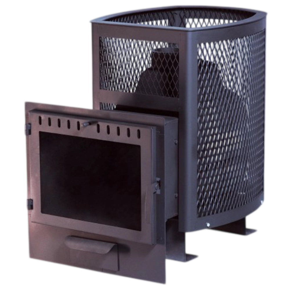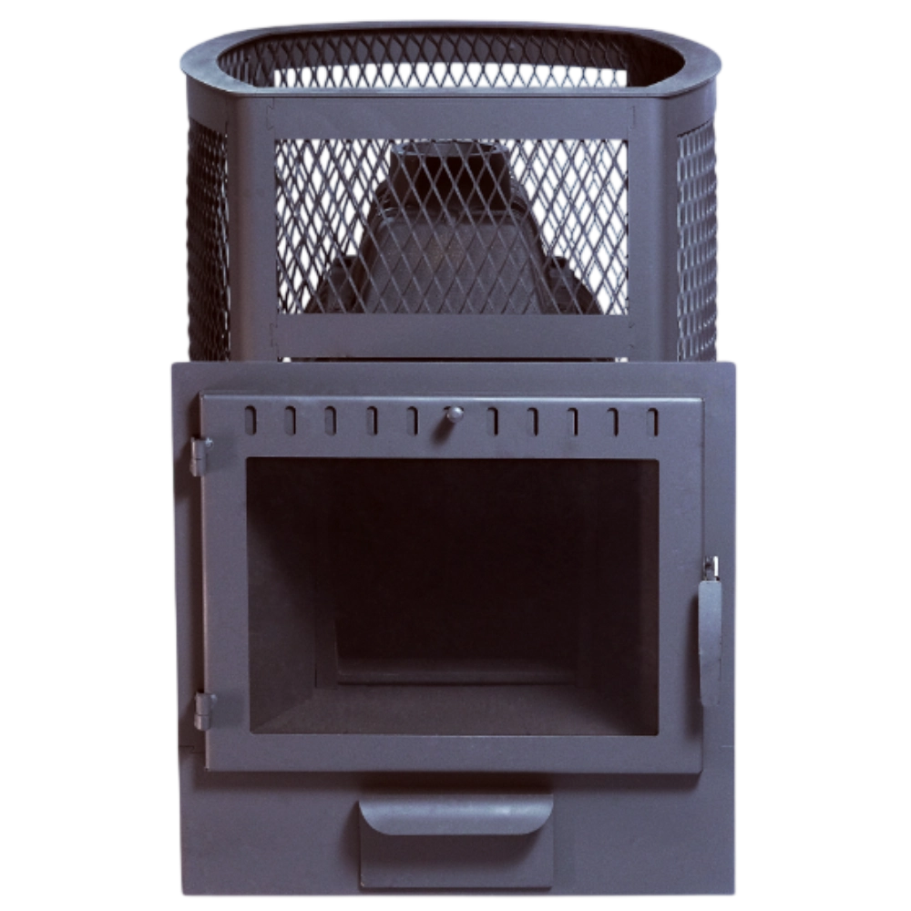 Позвонить в отдел монтажаЧугунная банная печь "Сибирь-22" с панорамной дверцей в облицовке сеткой для камней - один из доступных вариантов среди многообразия чугунных банных печей "Сибирь". Печь представляет собой традиционную сборную чугунную конструкцию, состоящую из 3-х сегментов: нижней и верхней частей топочной камеры, а также дополнительным элементом с дымоотводящим патрубком. Толщина чугунных элементов составляет 8-10 мм, в зависимости от тепловой нагрузки, получаемой в ходе ее эксплуатации. По периметру печи расположена сетчатая стальная конструкция, которая заполняется большим количеством камней, выполняющих функцию мощного аккумулятора и обладающей высокими теплоемкими свойствами. Масса камней, способных разместится в данной модификации печи составляет 180 кг, что создает неповторимую эстетику внутри бани и гармонизирует внутреннее
