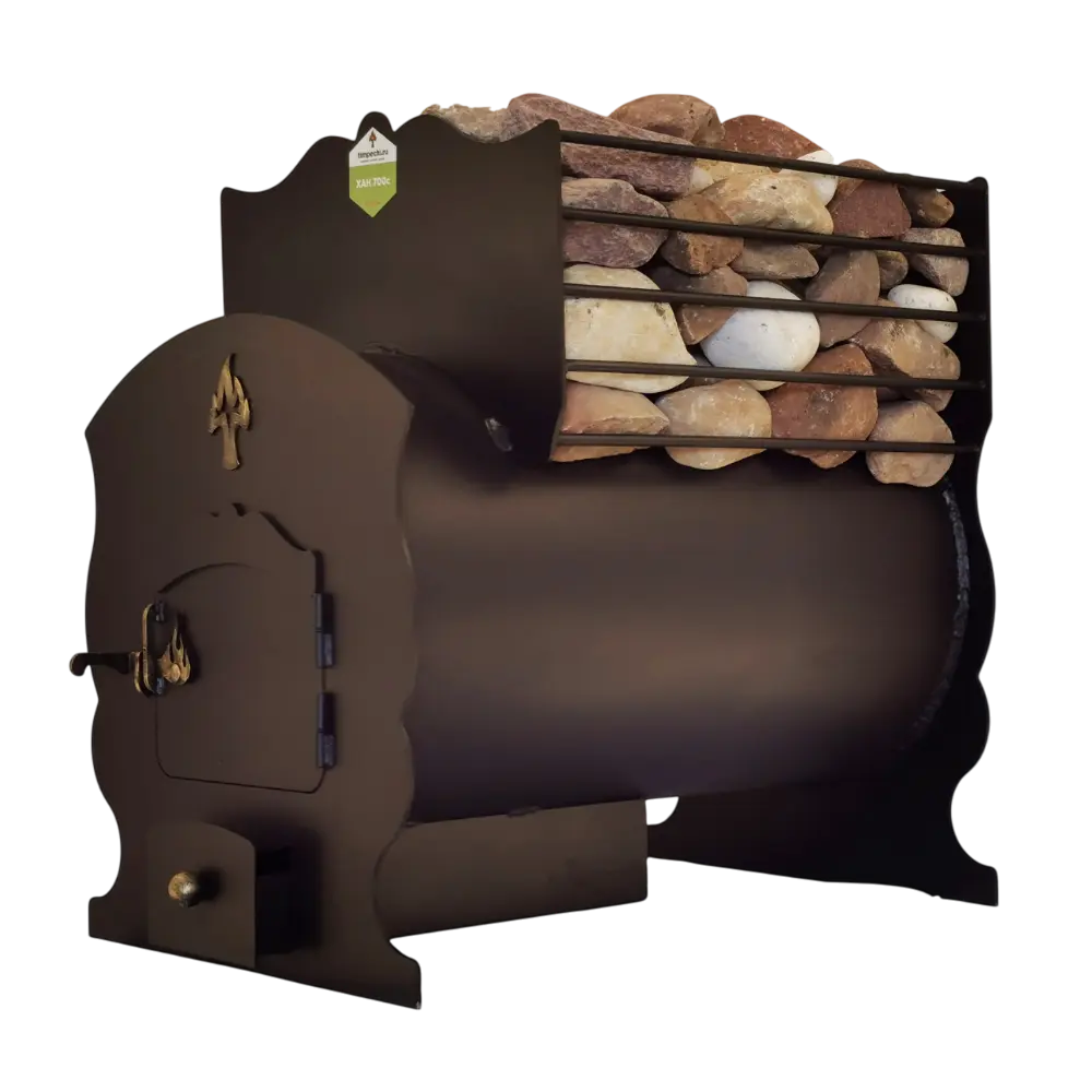 Позвонить в отдел монтажа«Хан 700С» – это банная печь с отличным соотношением цены и качества. Одна из самых популярных печей ТМ «Тимпечи». В ней сочетаются функциональность и надежность, красивый дизайн и невысокая цена. Срок службы печи для бани «Хан 700С» составляет 10 и более лет. Это достигается за счет: равномерного прогрева топки печи, благодаря цилиндрической форме, что исключает ее деформацию. А так же за счет усиленного свода топки изготовленного из жаропрочной стали толщиной 8мм. Банная печь «Хан 700С» очень удобна в эксплуатации: Благодаря большому объему топки и ее длине в 700мм парная набирает нужные кондиции в течение 40-80 мин после 2-3 закладок дров; Масса печи с камнями достигает 220 кг, что дает возможность аккумулировать тепло и просушивать помещение парной по завершении банных процедур, избегая, таким образом, появления плесени и грибка, и продлевая срок службы бани; Система сложного дымохода обеспечивает максимальный КПД печи и позволяет экономить дрова; Прочистное отверстие в дымовыводящем коробе позволяет прочищать печь от сажи без демонтажа дымохода.