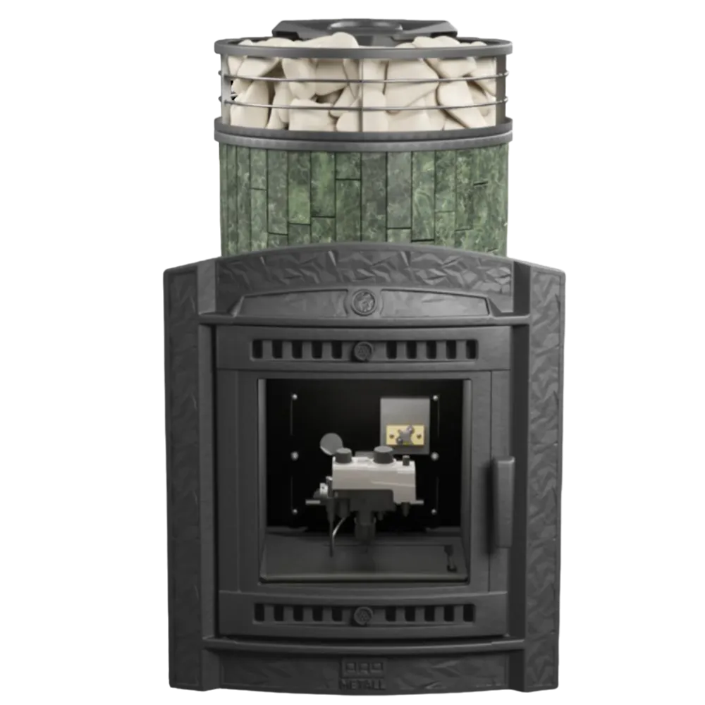 Позвонить в отдел монтажаПрактичная и компактная модель. Ламели из змеевика по периметру внешней каменки не только обладают хорошими теплонакопительными свойствами, но и придают печи оригинальный внешний вид.