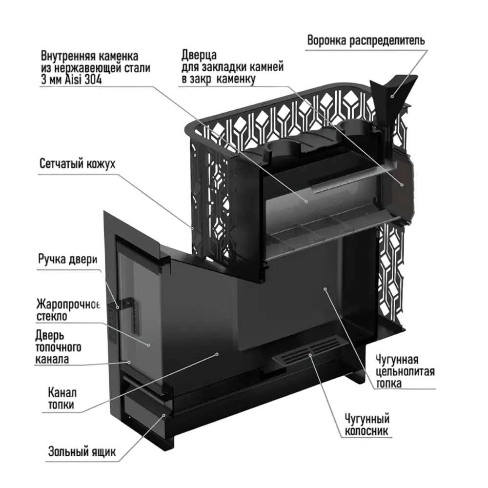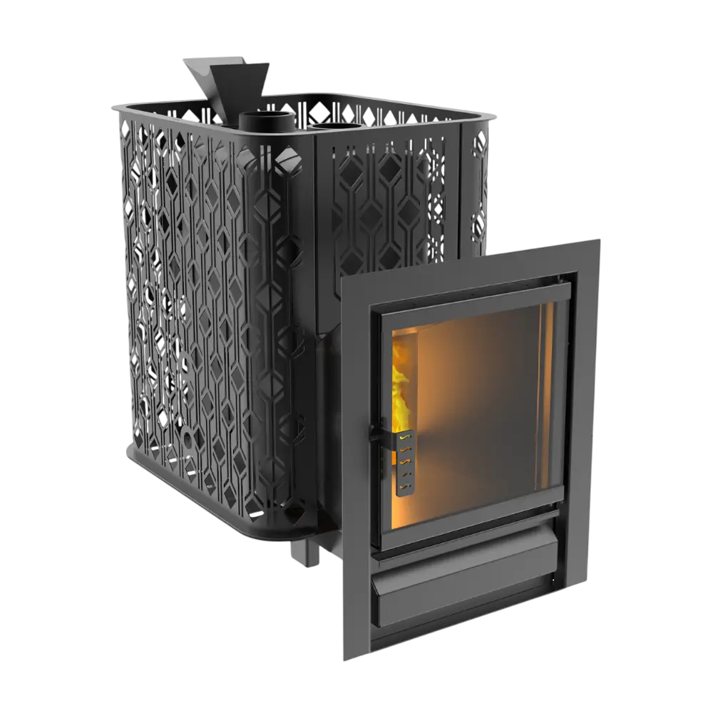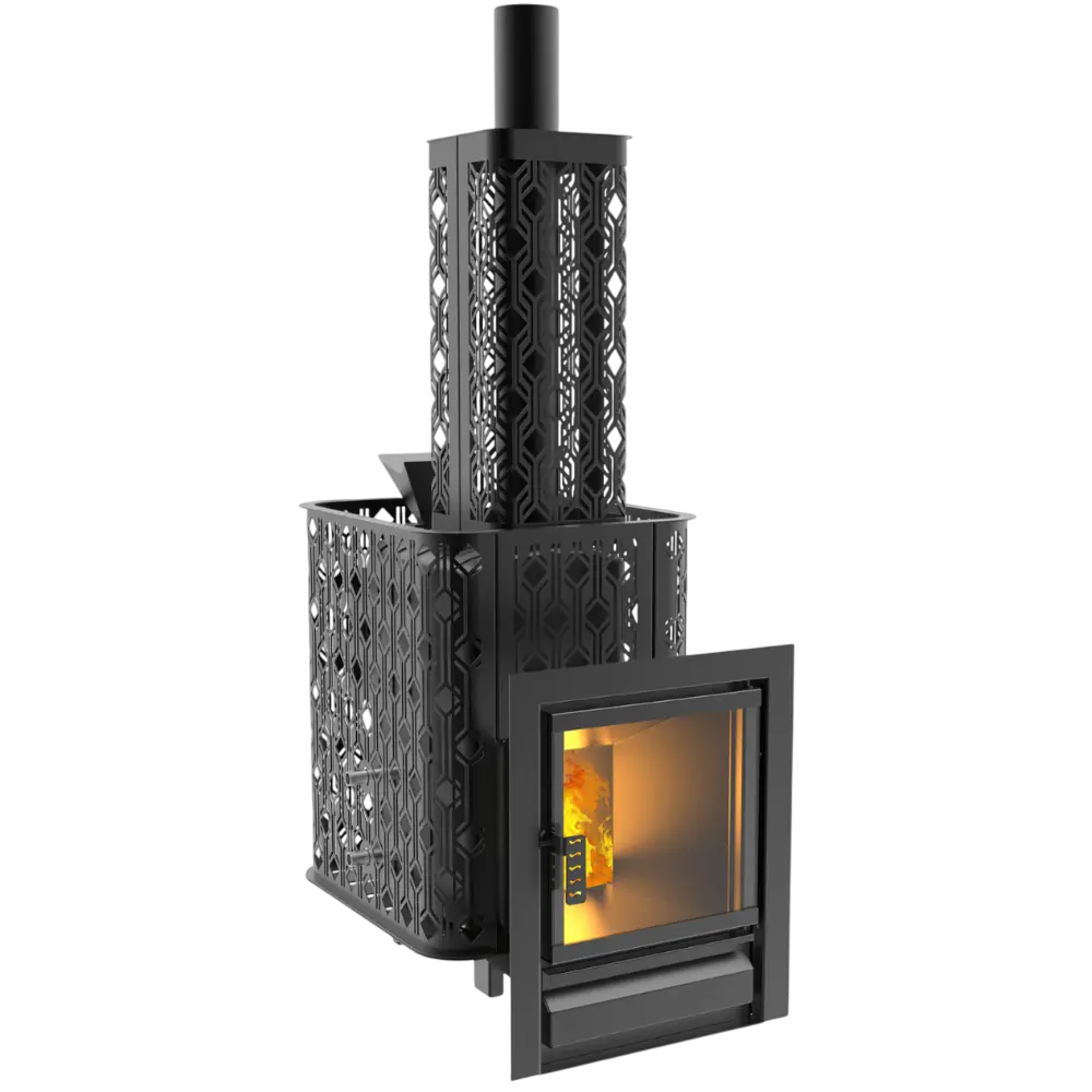 Позвонить в отдел монтажаНесомненное качество банных печей Black Stove достигается новейшим оборудованием и строгим контролем на всех этапах производства! Технологии применяемые в производстве банных печей позволяют добиться максимальной точности подгонки деталей в совокупности с инновационными решениями получения высокого количества энергии при минимальном расходе твердого топлива! Фасад остеклен панорамной термостойкой прозрачной стеклокерамикой выдерживающей, благодаря своему чрезвычайно низкому температурному расширению, данная стеклокерамика выдерживает высокие температуры до 760*С! З, Экономичное горение и система обдува стека! Сочетание дизайна, мощи, универсальности и качества. Печь имеет закрытую каменку с воронкой клапаном для поддачи воды на самые раскалённые камни, уложенные в Закрытой каменке! Оригинальная безрамочная дверца с Огромным стеклом подчёркивают стилистику печи! Нижняя часть камеры сгорания выполнена с утолщением, на дне расположена чугунная колосниковая решётка, по всей плозади нанесены усилители в виде рёбер жесткости! Заглушки на боковинах для установки на левую или правую сторону бака-контура(Теплообменник) в камеру сгорания! Теплообменник изготовлен методом холодной штамповки и аргонно дуговой сварки, из 2 мм нержавеющей стали Aisi 304