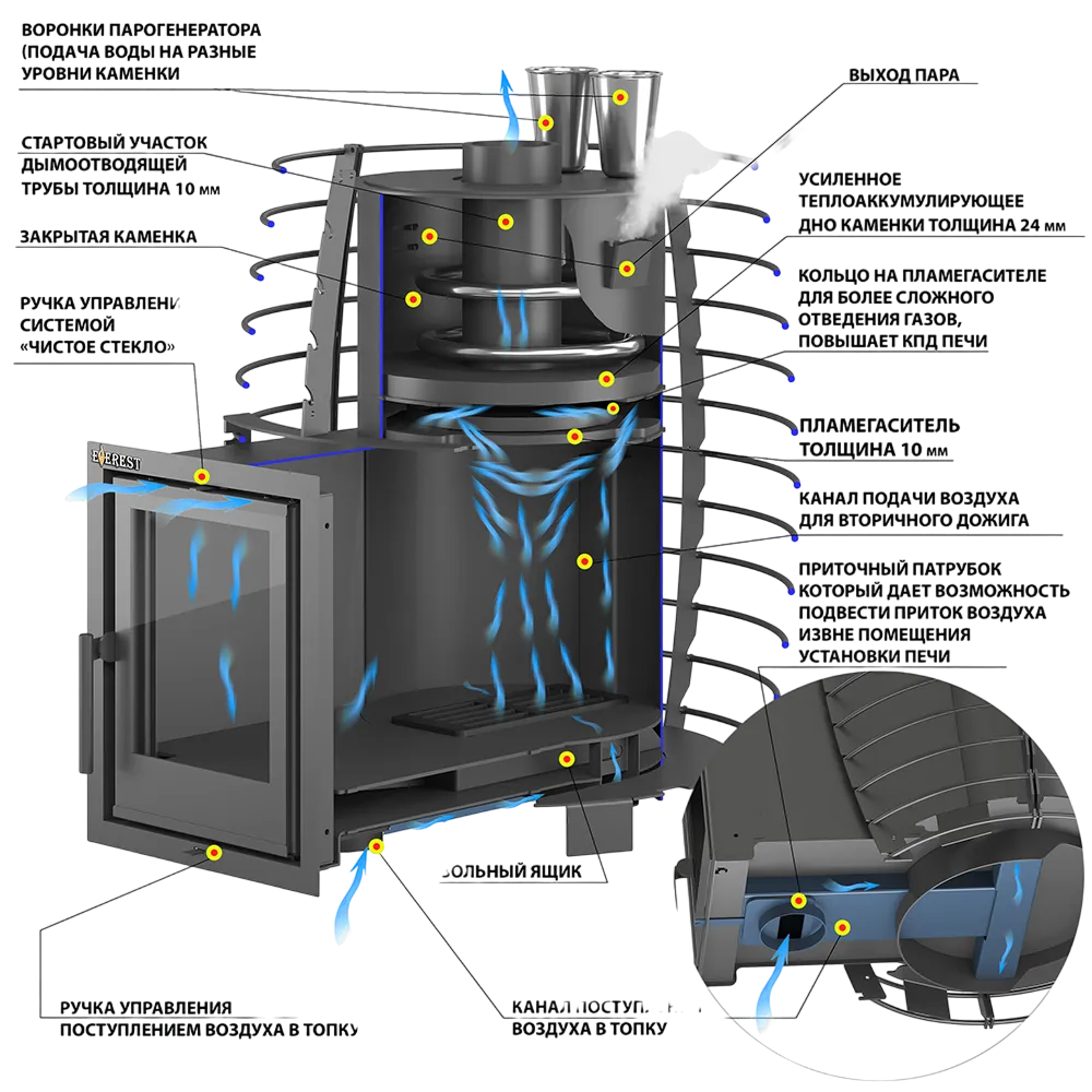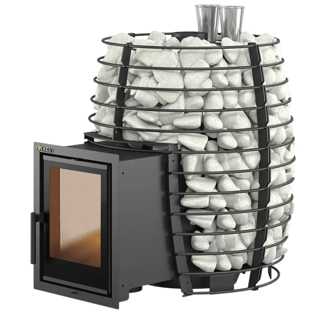 Позвонить в отдел монтажаСталь толщиной 24 мм, интегрированная каминная дверка, системы чистое стекло, вторичный дожиг, неповторимый дизайн и звук вьюги. Всё это - про новую печь для бани Эверест Steam-Нeat 24.