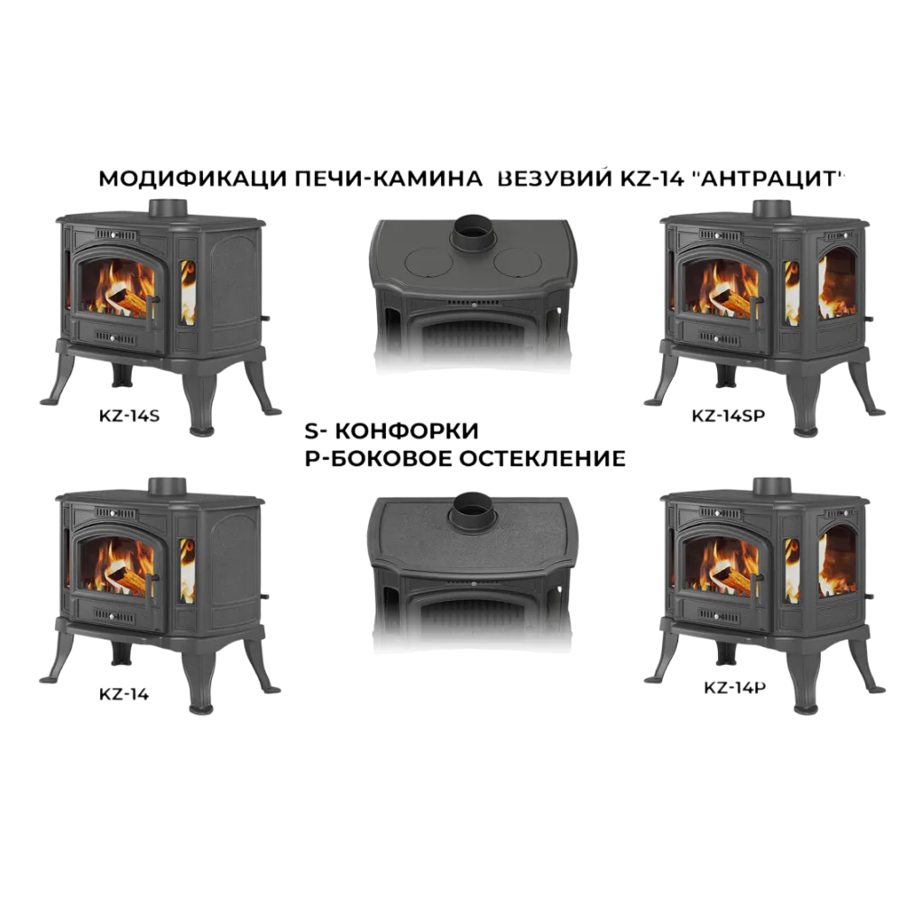 Позвонить в отдел монтажаПечь-камин Везувий KZ-14 изготовлена из качественного чугуна с толщиной стенки 8-10 мм. Модель рассчитана на обогрев помещений объёмом до 280 м³.Топочная камера с двойными чугунными стенками. В нижней панели предусмотрена колосниковая решётка. Дверь изготовлена из чугуна и оснащена большим панорамным стеклом в виде арки. С двух сторон от двери установлены две стеклянные вставки. На модели KZ-14Р по бокам установлены стекла. Чистота стекла во время работы обеспечивается системой подачи воздуха на внутреннюю сторону стекла. Воздух отсекает дымовые газы и пламя от поверхности стекла, предотвращая закопчение и потемнение стекла. На моделях KZ-14 , KZ-14S Ручка управления системой размещена в верхней части передней панели, над дверью у KZ-14Р с боку над стеклом. В нижней части двери размещена ручка задвижки для подачи воздуха на первичное горение. Вторичный дожиг в печи-камине обеспечивается двойной задней стенкой: здесь между стенкой и внутренней облицовкой топки из чугуна есть канал, идущий из поддувала под нижний край пламегасителя, в зону активного горения. Воздух для вторичного дожига поступает в верхнюю часть топки, усиливая горение и повышая теплоотдачу. Вторичный дожиг регулируется заслонкой, расположенной на задней стенке печи-камина. Ручка управления заслонкой находится справа. Зольный ящик коробчатого типа изготовлен из стали и закрывает пространство под колосниковой решёткой. Патрубок дымохода – универсальный, со сменным положением. Он может быть установлен сверху или сзади, в зависимости от размещения печи в помещении.