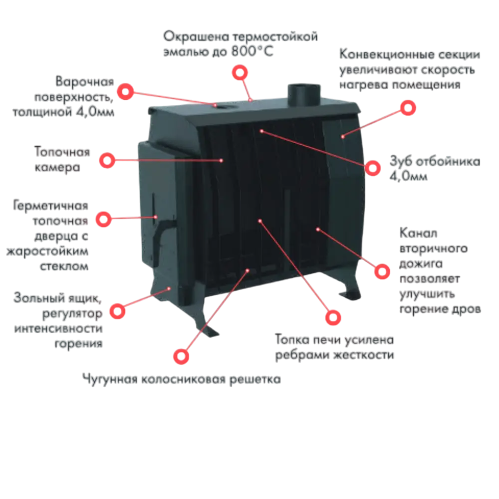 Позвонить в отдел монтажа"Печь отопительная Кеннет Ария 100 предназначена для обогрева помещения объемом до 120 м3. Печь может использоваться для отапливания дачи, гаража, теплицы и позволяет подогревать пищу. Диаметр дымохода 115 Количество щелевых конвекторов 7шт Вид топлива дрова (длина полена) 500мм Габариты ВШГ 745х430х625мм Особенности печи Кеннет Ария 100: • Печь изготовлена из котловой стали толщиной 3мм • Чугунная конфорка с двумя кольцами разных диаметров позволяет готовить пищу на открытом огне в посуде разного размера, загружать топливо сверху и прочищать от сажи верхнюю часть печи. • Печь окрашена черной термостойкой краской, температура применения до 1000С • Увеличенная площадь поверхности печи и конвекционные потоки быстро прогревают помещение • Интенсивность горения удобно регулируется изменением положения зольника • Отсутствие внутренних полостей, на которые может оседать сажа, упрощает эксплуатацию печи."