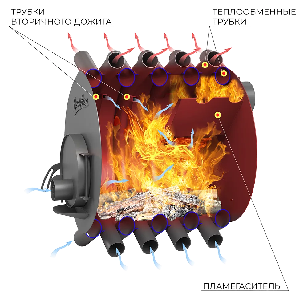 Две камеры сгорания, нижняя камера газификации и верхняя камера дожига газов, обеспечивают практически полное сгорание топлива и получение максимального количества энергии во время работы печи.
